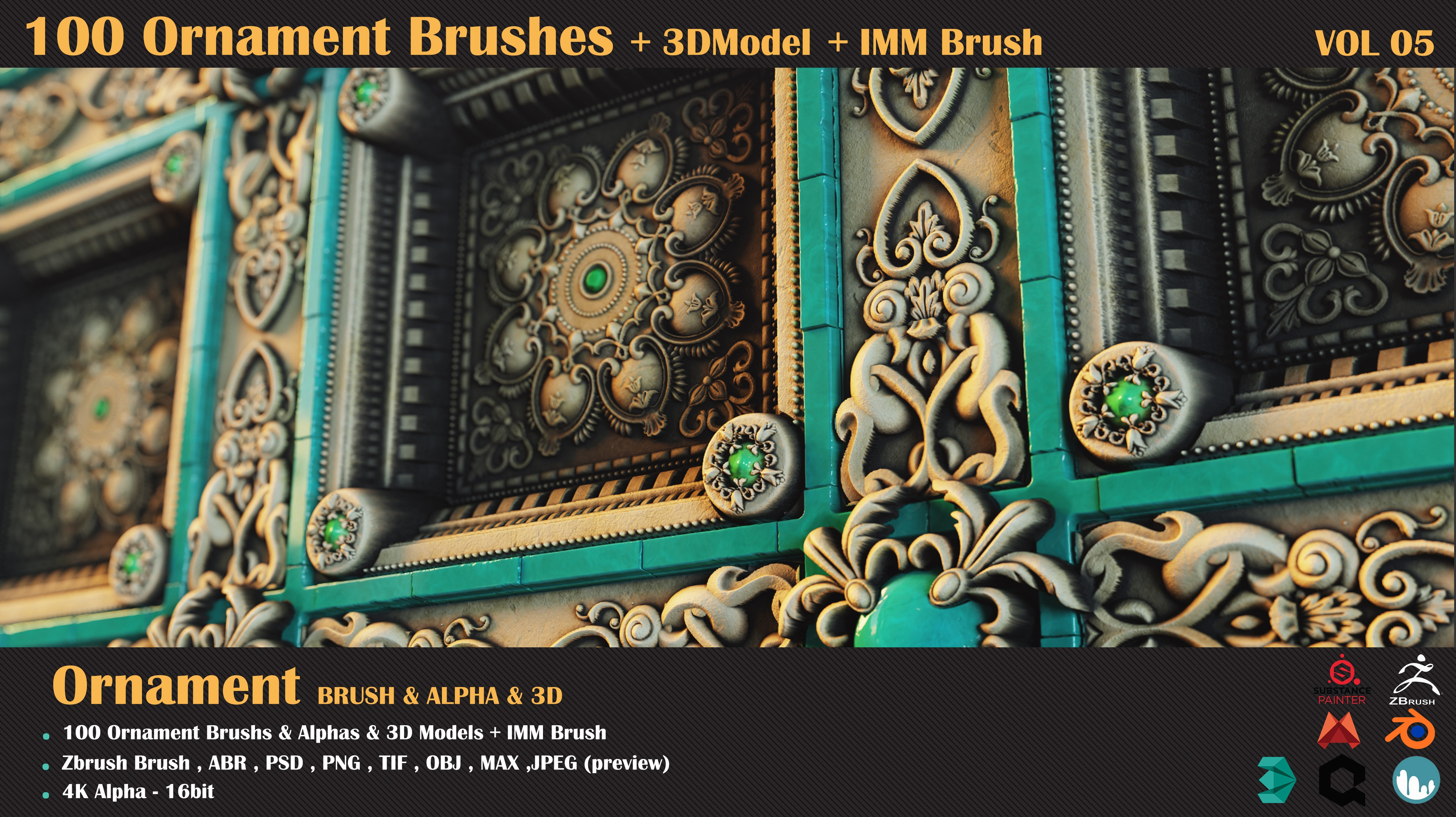 100 Ornament Brushes and 3D Models + 3 Video Tutorials-VOL 04: https://www.artstation.com/a/26381