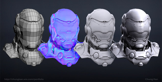 Part 2 is 87 videos, 8 hours, and covers the entire game res process, from retopology all the way to real time rendering solutions. ZBrush retopology, Maya 2016 modeling toolkit retopology, redirecting edgeflow for animation, Headus UV layout, Maya UV tools, ZBrush UV Master, baking maps in Substance Painter, XNormal, ZBrush, Maya, and Substance Designer, texturing in Substance Painter 2.0, rendering in IRAY, Marmoset, and Octane.