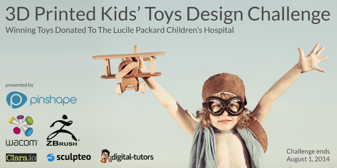 Pinshape is happy to announce the 3D Printed Kids’ Toys Design Challenge. We’ve teamed with some great 3D industry partners to offer an amazing set of prizes to entrants, and hopefully brighten the day of sick kids through the magic of 3D printing. We’ll not only provide physical prizes to the winners, but we’ll will give them access to a huge audience on Amazon.com, who Pinshape recently teamed up with, and most importantly, we’ll donate 3D printed versions of the top toys to the Lucile Packard Children’s Hospital.