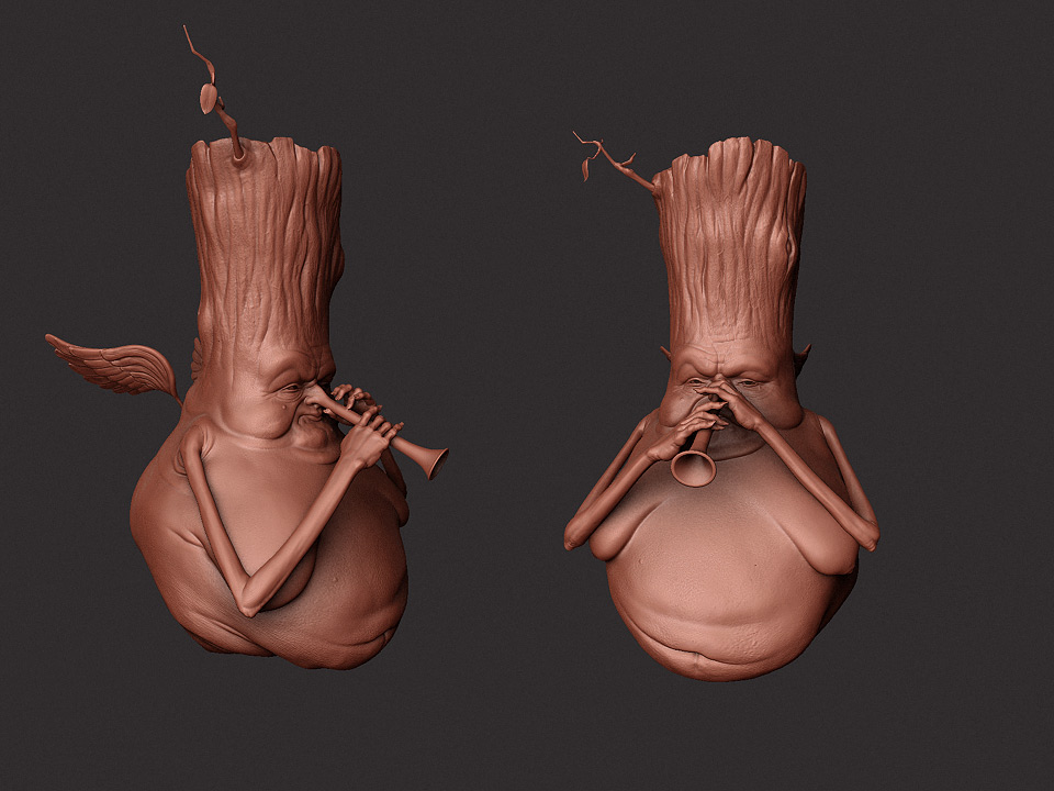 My workflow for the last one: i started with very simple base mesh for the main body, and for the branch and the hands i used zspheres.