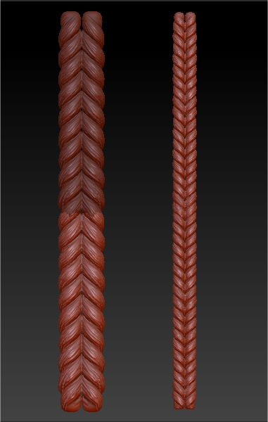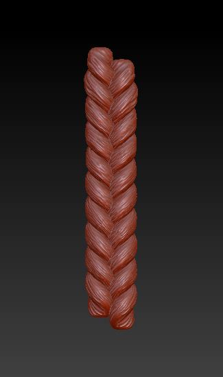 Convert to a polymesh and Unify. Texture as desired. I used the Standard Brush, Damian Standard and accented the grooves with the Slash 3. This is one (longitudinal) half of the braid.