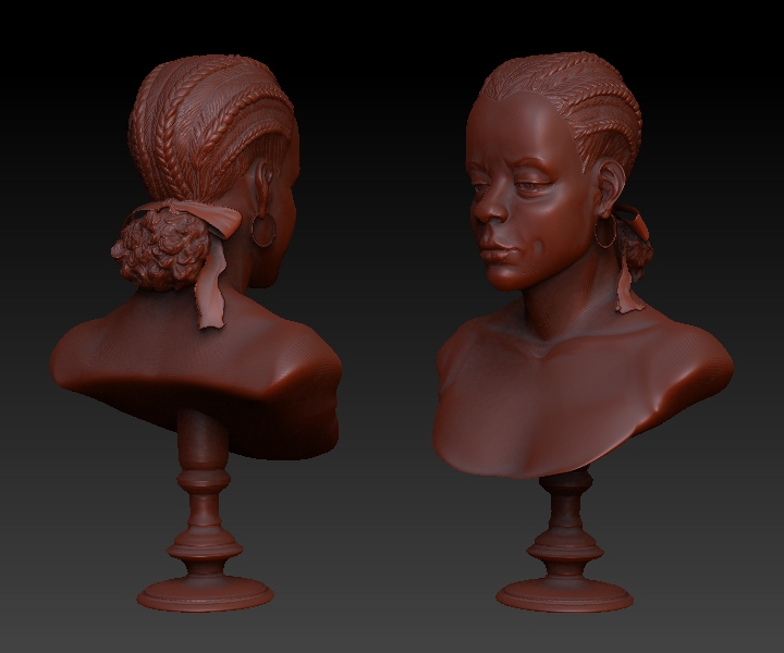 Inspired by Ryan Kinglien’s “Bust with Flowing Hair” Tutorial from Gnomon, I’ve been doing “Hair Studies”, modeling one hair style after another on the same bald bust. One of those styles was braids. Because my roots are in clay, I adapted a clay based method. While not as elegant as the Alpha based method I’ve subsequently found, it’s simple enough for the ZBrush novice.