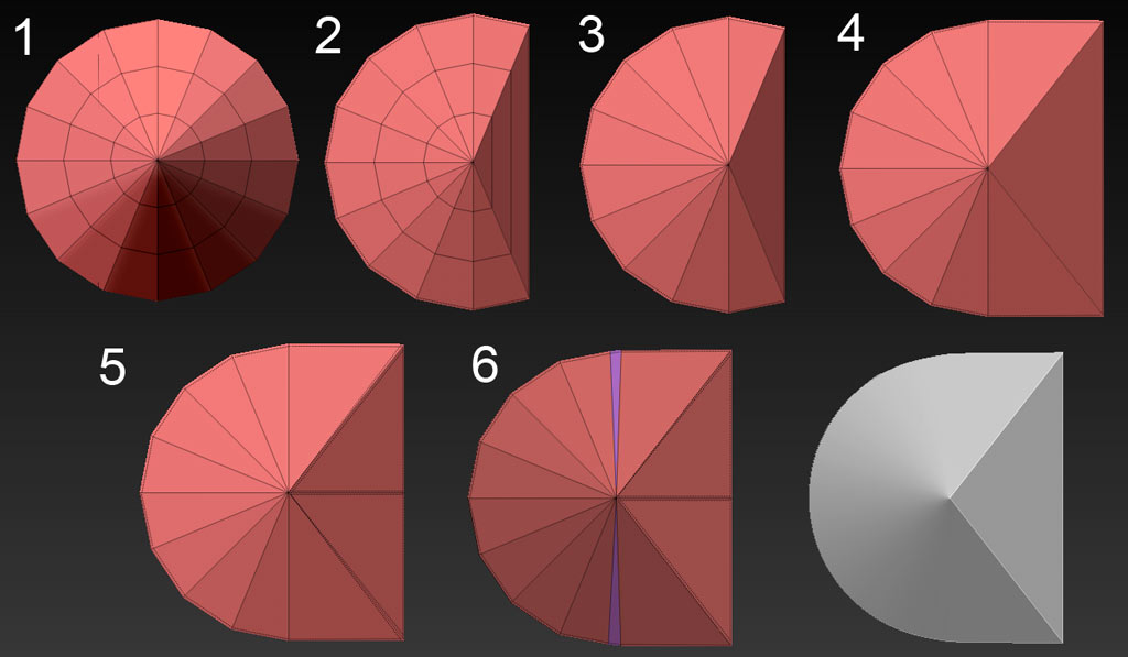 Thank you so much for your response. That is super helpful, as I was in a dead end looking into a high poly solution, trying to clip a high poly cone with a boolean cube rotated 45 degrees. I like your solution, except I am struggling to go from 2 to 3 in your helpful steps? I am not so good with zmodeler. I have been trying to delete these 2 vertical edges, they wont go away.
