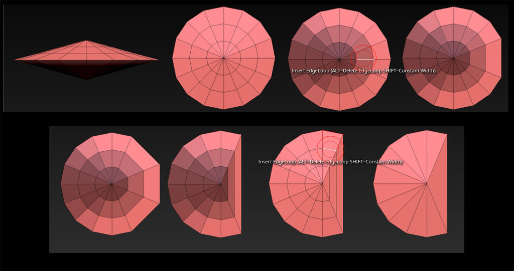 Ok, so what I’m doing there is basically just using the Edge > Insert Edge Loop > Single Edge loop function. It inserts an edge loop, or if Alt is held, it will instead delete a loop. I just went around and eliminated loops that were not contributing to my shape. You can set the Point and Poly modes in ZModeler to “Do Nothing” if you don’t want to accidentally perform an action on anything but the edges.