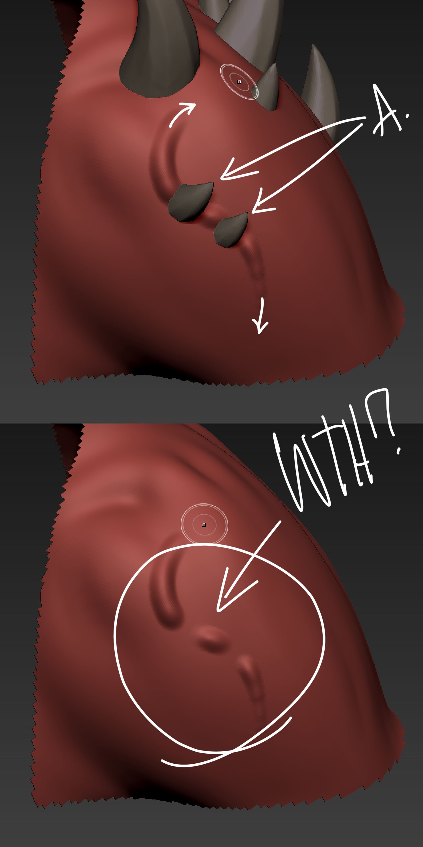 a. i run a stroke along my mesh . the boney stuff is another subtool.