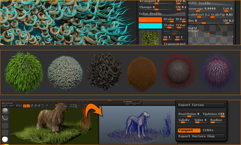 FiberMesh™. Significant advancements to the FiberMesh™ settings provide you with greater control and flexibility. Curve modifiers have now been added to a number of FiberMesh™ settings including: Length, Coverage, Gravity and Color Profile. Revolve has also been added as a new setting. Textures applied to FiberMesh™ and MicroMesh objects can now be transparent (true black pixels will be hidden), allowing even greater diversity in their use. FiberMesh™ settings can now be saved and loaded as needed it. In addition, various FiberMesh™ presets will ship with ZBrush 4R3. These presets can be pre-viewed in Lightbox, as well as modified and shared amongst ZBrush artists. Once you have styled your FiberMesh™ to perfection, export the fiber guides to other applications for further use. Moreover, fibers can also be exported as unique vector displacement maps to be rendered in external applications.