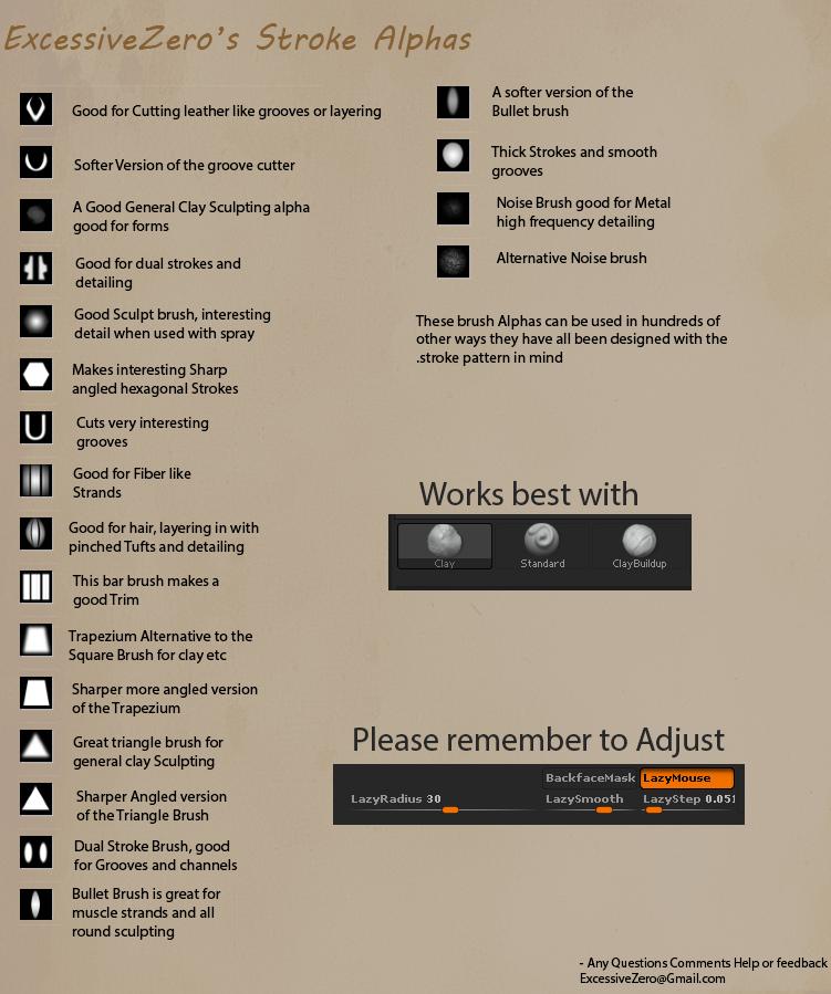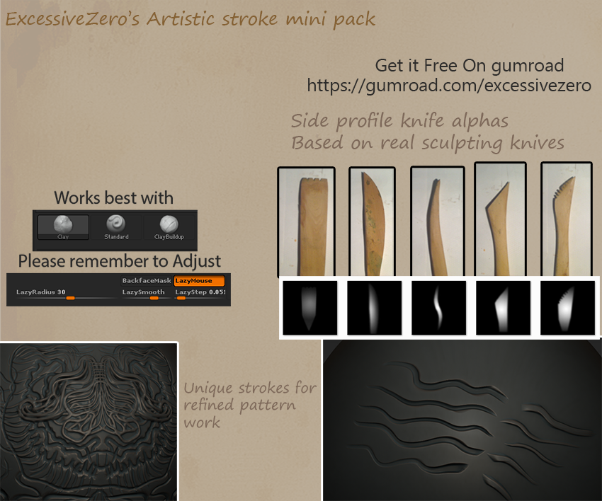 this pack mainly came about as I didn’t feel any alpha brush pack I had seen was doing what I wanted, far too many seemed focused on stamping detail opposed to getting good and interesting artistic stroke profiles like you would find in Photoshop brushes, or sculpting knives.