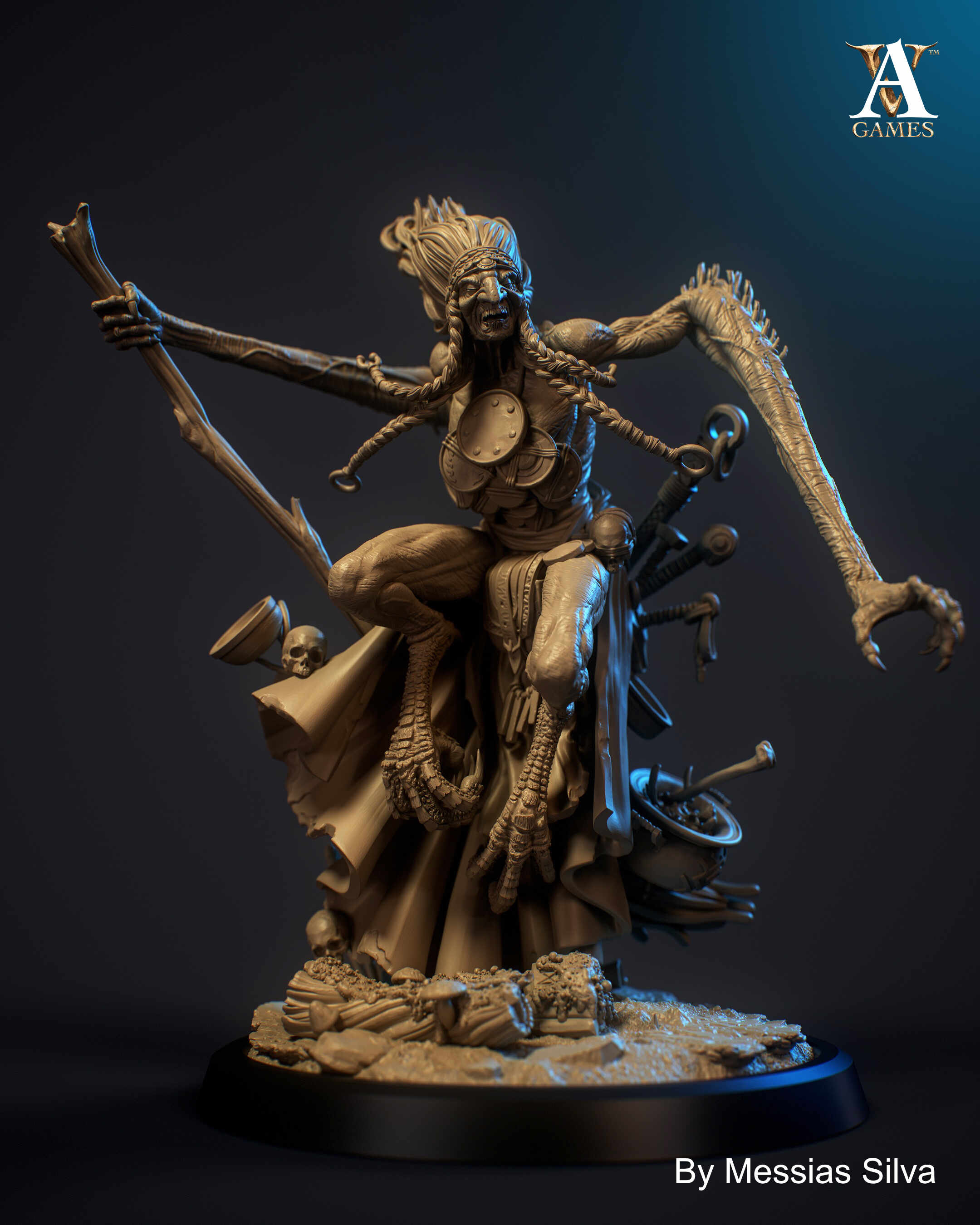 The base was built to complement the ritualistic theme of the bundle, blending organic textures, bones, and subtle narrative fragments into a cohesive composition.