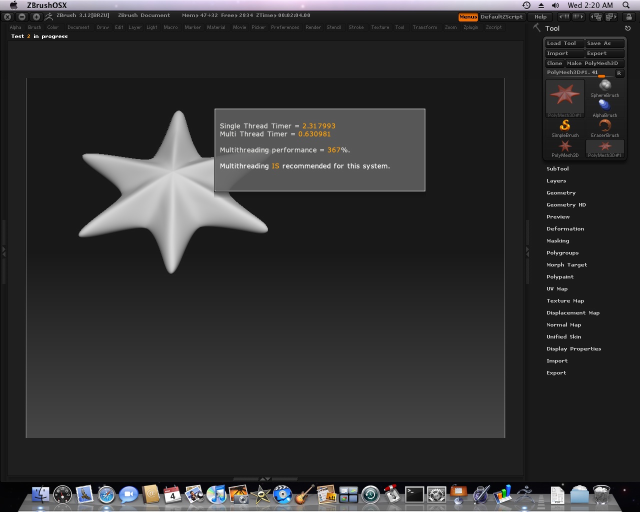 ZBrush only uses four gigs of RAM and no more. Its the number of cores that matter. I hope ZB4 will be for 64 bit and advantage it all. The extra RAM is sure nice in other software though. I’m able to stitch HDR images into Panorama’s now in PS CS4. Lightwave is like a whole new experience now compared to my old Core Duo 32 bit machine.