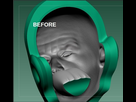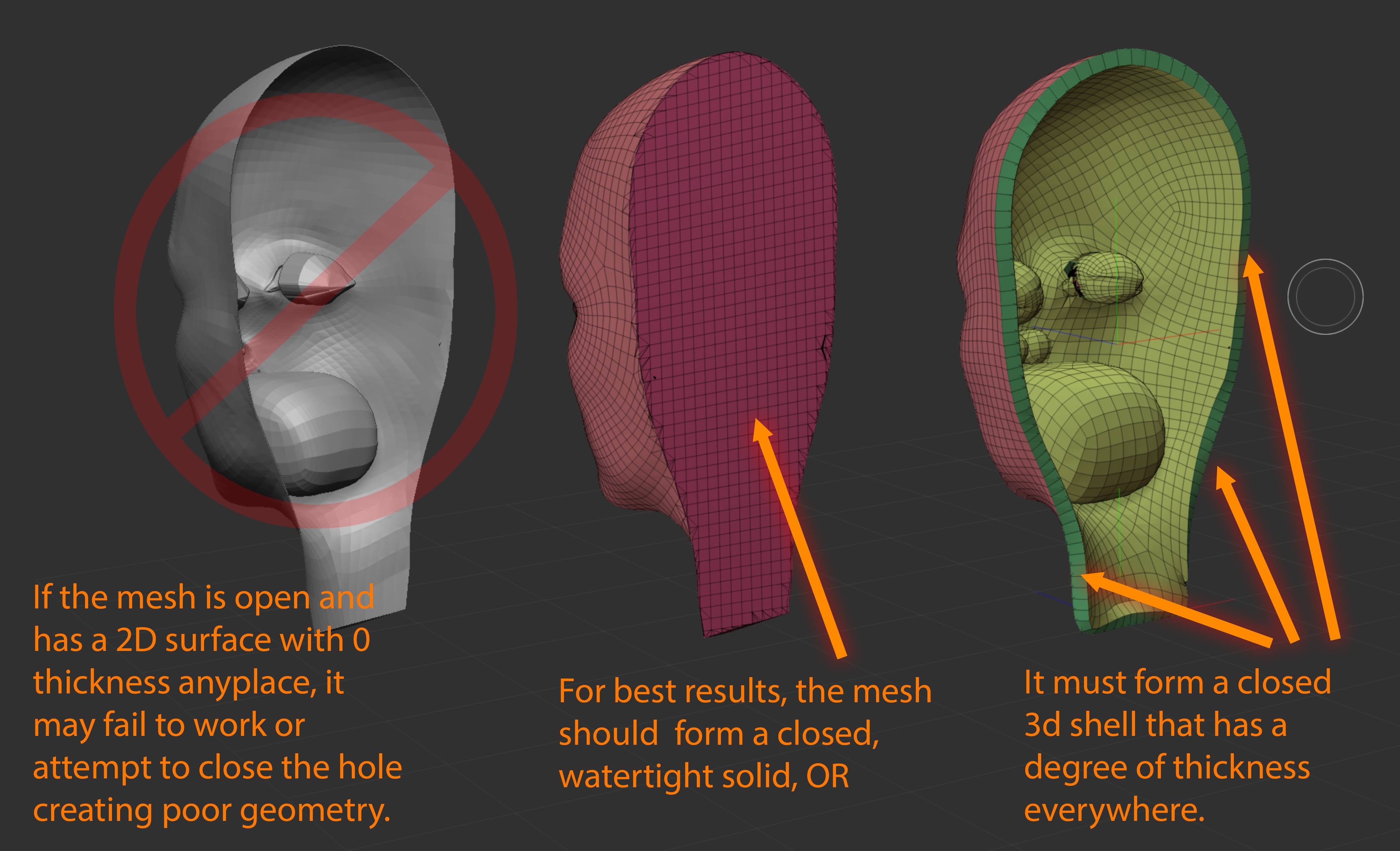 If you’ll forgive me for lingering on a point, please allow me to illustrate something I cannot determine from the available pics. Live Boolean requires closed, watertight solids with a degree of thickness for the best results. If your mesh is 2D or open any place, Live Boolean may fail to work as expected or attempt to close the hole, creating awkward geometry. While the pics of the interior of the head suggest an outer border that may have thickness, I can’t tell if the surface of the face is a 3D shell or not:
