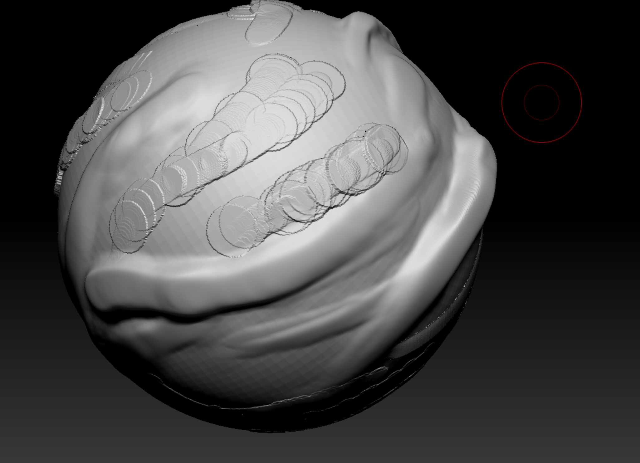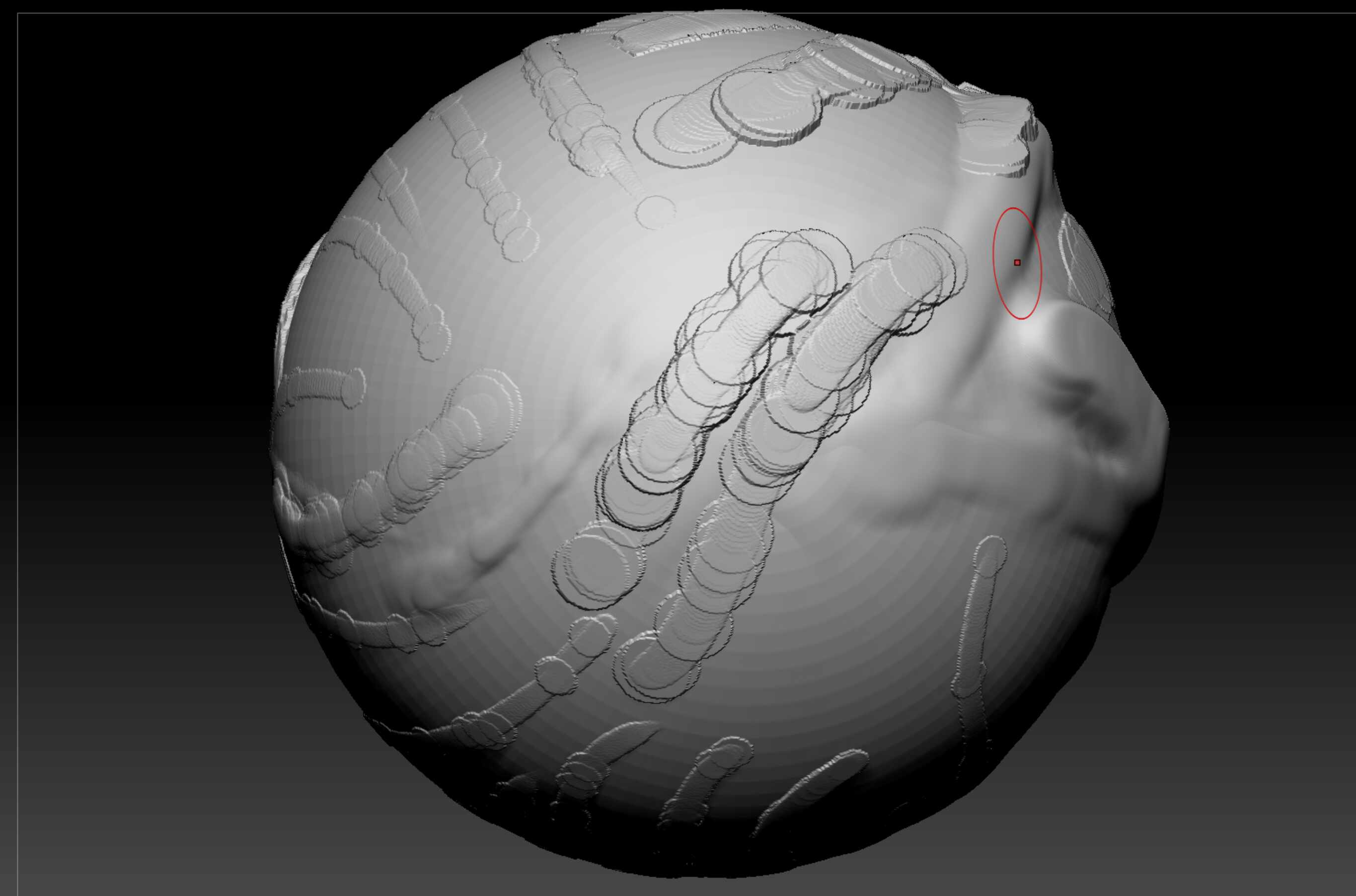 Even with an incredibly consistent stroke, some points of the stroke apply a much larger sample of the brush (this occurs with or without an alpha selected.) I’ll attach pictures so you can see what I’m talking about. Is there any way to force Zbrush not to throw in these seemingly random and relatively huge stamps during my brush stroke?