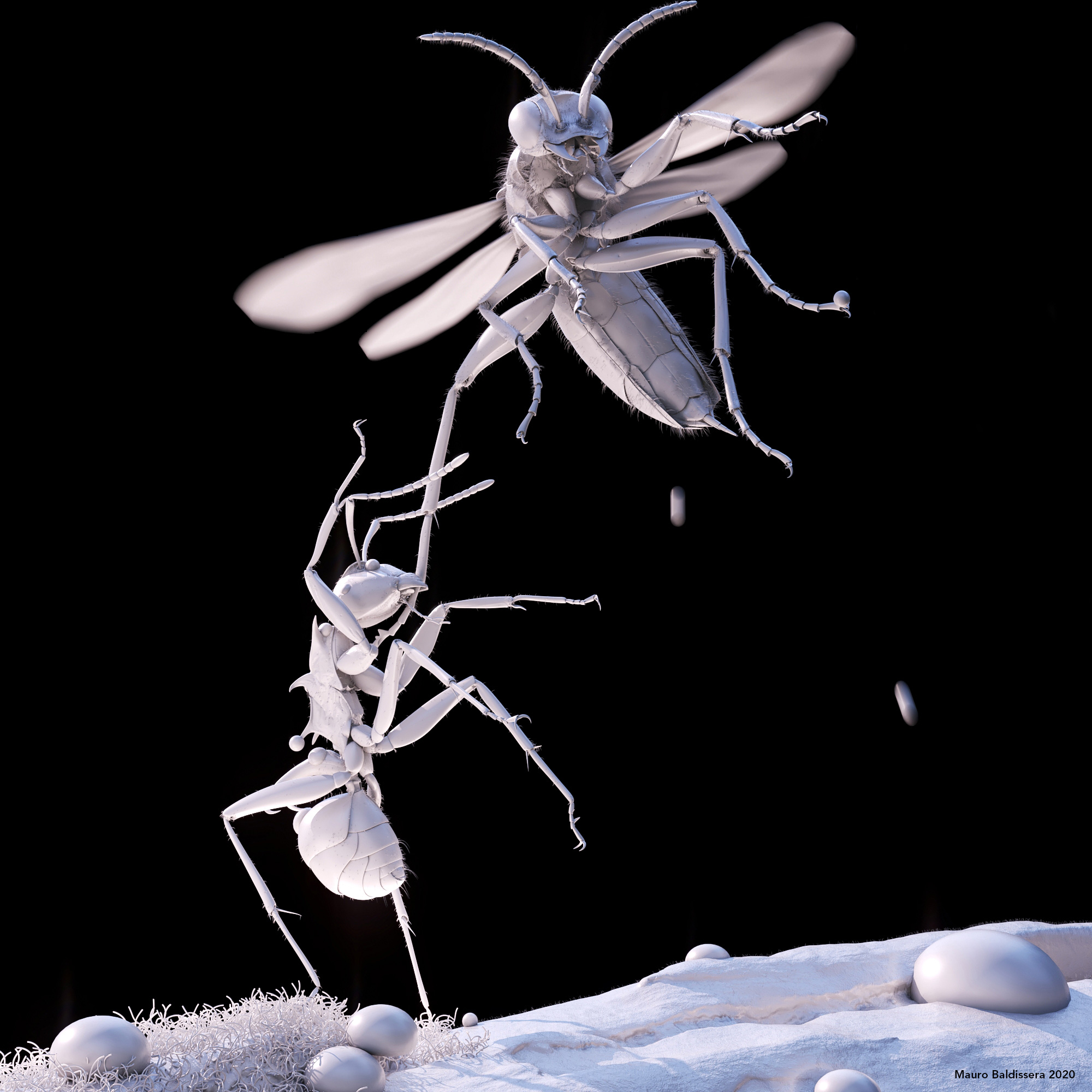 Modeled and rigged in Maya, displacements, Albedo maps created with Zbrush and rendered with Vray.