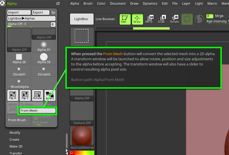 You can also use “From Mesh” in the Alpha palette. It will export a PSD file with 16 bit depth and a maximum size of 2048x2048. If you need a larger size, you will have to change the Document to the size you desire and then use “GrabDoc” in “Alpha > Transfer” as Spyndel mentioned.