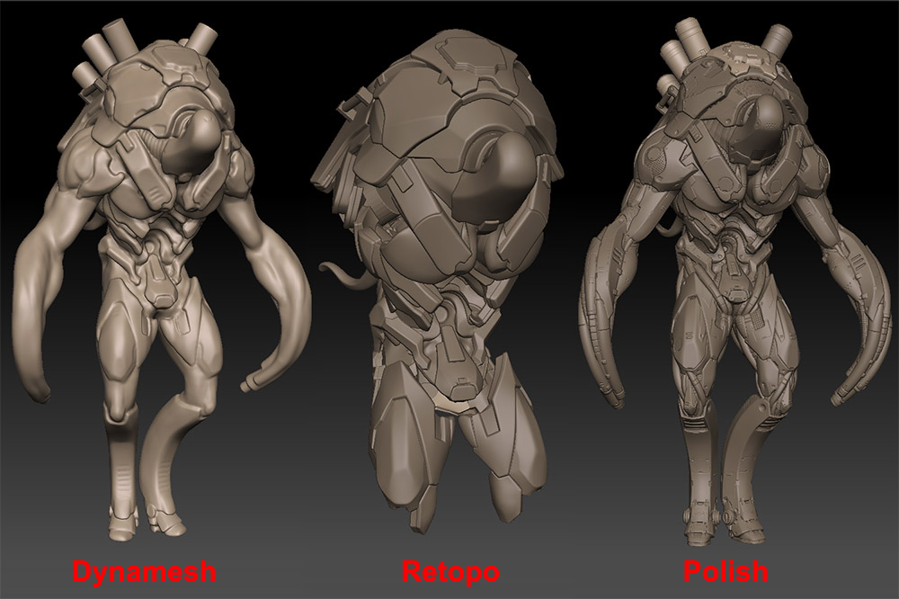 Concept (Dynamesh) — Retopo (ZSPhere) — Polishing (brush + alphas)