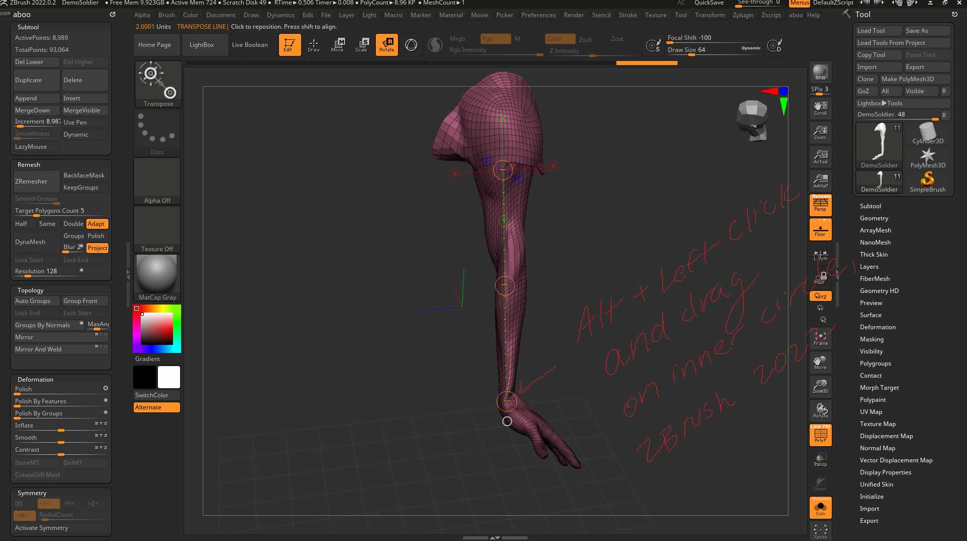 I’ve attached screenshots of the same action performed in ZBrush 2022 and 2021 on the DemoSoldier’s arm with Alt+Leftclick and drag on the inner circle of the outer node of the action line, with the intended effect of smoothly flexing the wrist up towards the forearm.