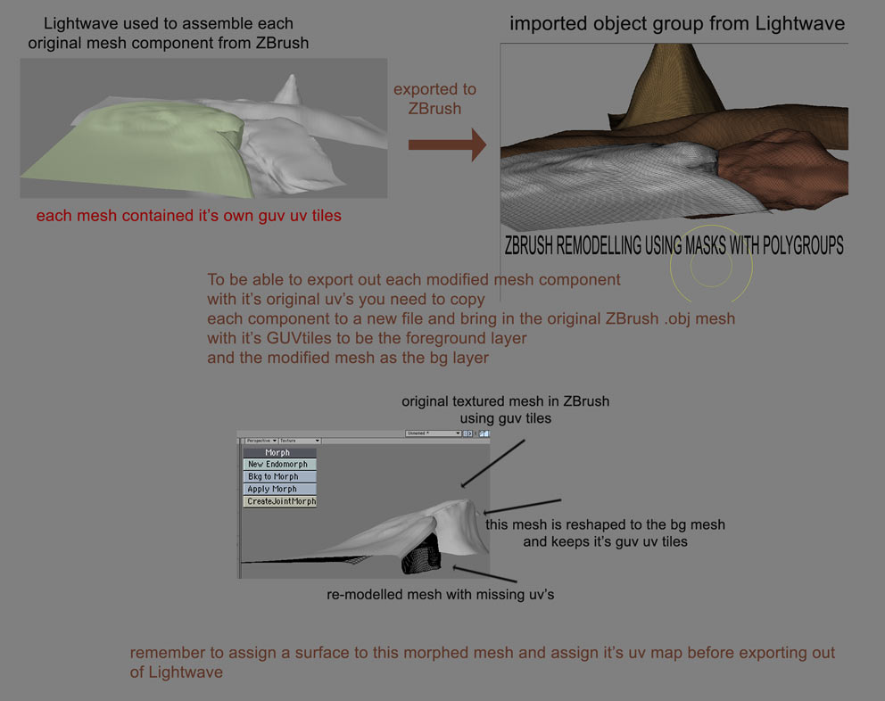 ( I realise that Lightwave 8 has magnet and dragnet tools etc for such mesh tweaking tasks but I don’t personally find the control as intuitive or speedy as I do creating alteration with ZBrush - each to their own)