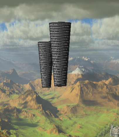 Here a pic of the ZBrush Buildings. Later simply wedged in between two PS layers, then blurr and color corrections… Still tweaking so… Buildings are simple cylinders which were masked and negative inflated, then tapered. Instant windows…