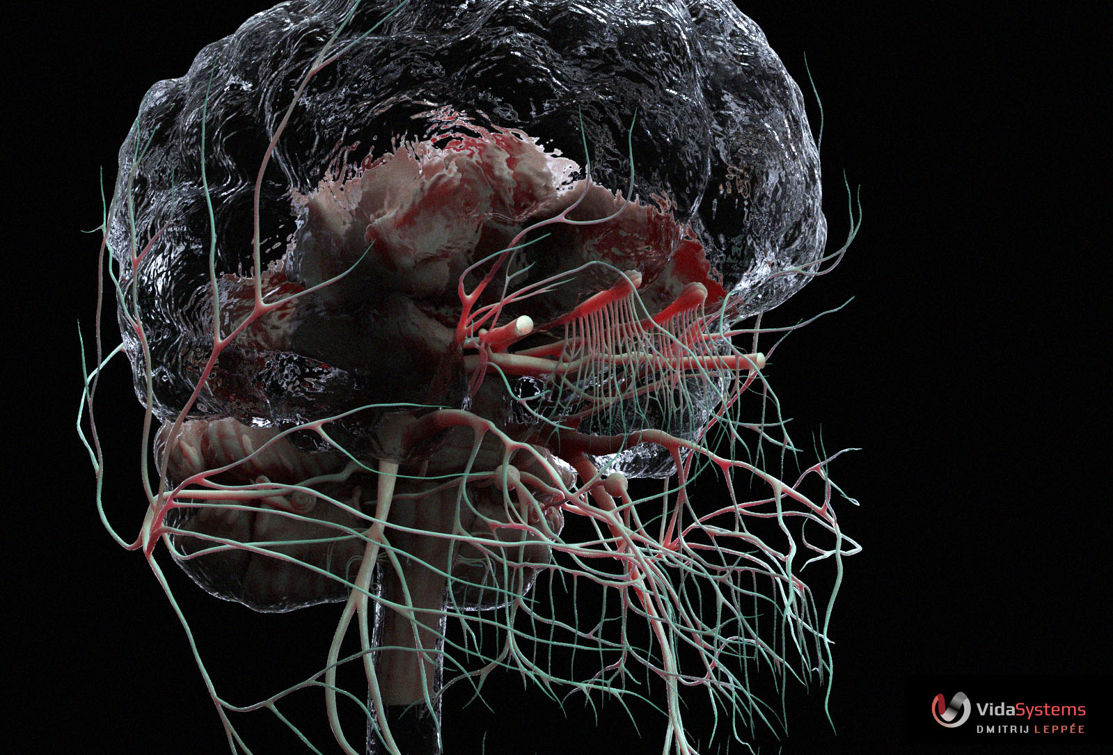 Cranial nerves coming out of the brain stem were modeled with Zspheres with skull as a reference to lay them on top of, and the brain fibers with a custom insert multimesh brush laid piece by piece on top of specially prepared bits and pieces of the interior of the brain.