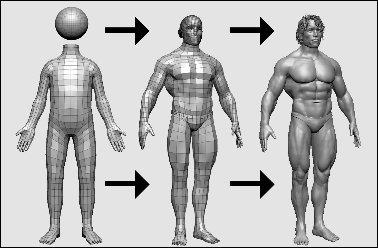 Hey all! I was very much inspired by the recent bodybuilder in top row, to do one myself. I find the subject great for anatomy study and am having a lot of fun. Here’s the blocking stage. Very simple mesh in 3ds max for the body, and a polysphere for the head. To be continued.