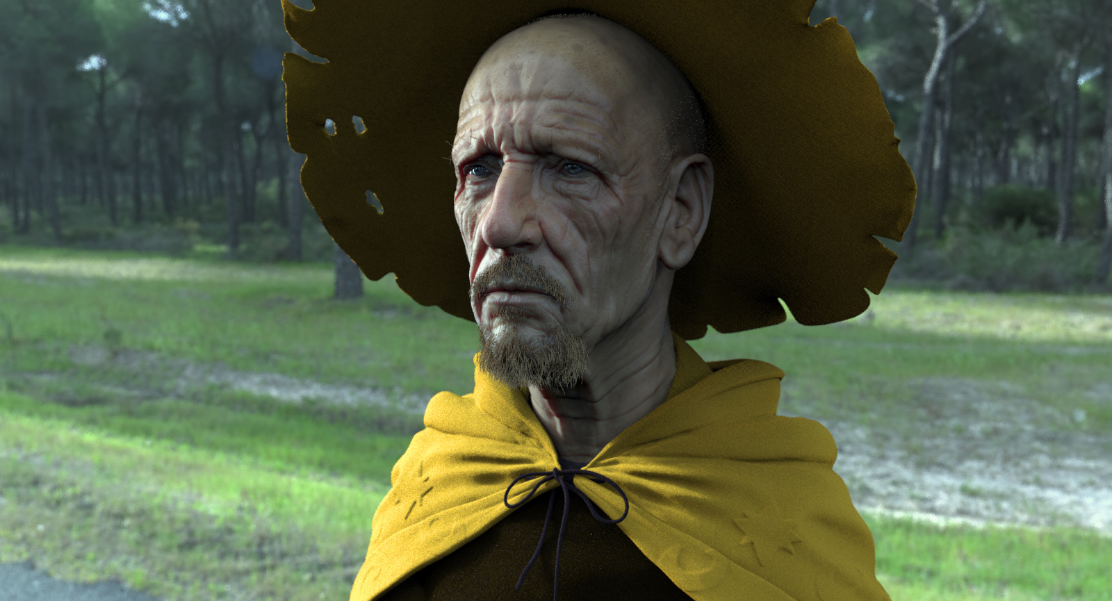That came out nicely. The yellow/violet complementary colors make an interesting combination to his sad and thoughtful gaze. I also like how the eyes look wet and react to the light in a realistic way.