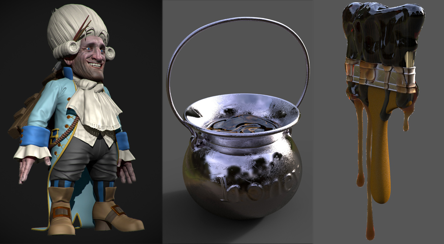 New updates. Casanunda is almost finished, still need to pose him and will try a fibermesh but I am still to find out if these side rolls can be pulled of with it, already tried it with a couple of different approaches but with no luck so far. The other two pictures are also accessiories for the final scene, and these are tests of materials in Keyshot, primarily getting the honey shader right. Still a long way to go, but it will have to wait some future free time.