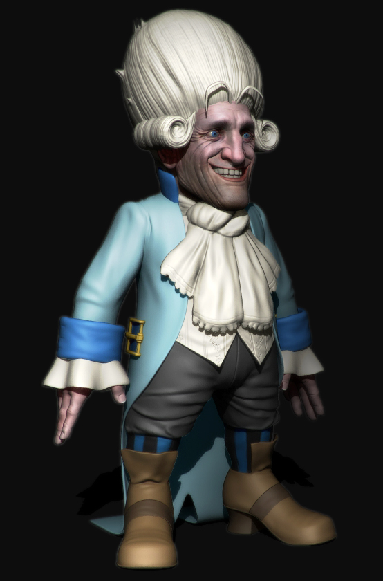 LOL that’s creepy… I think you should loose the big ‘tongue’ sticking out of the boots [because his legs are so short] and give him the typical period large fancy buckle shoes