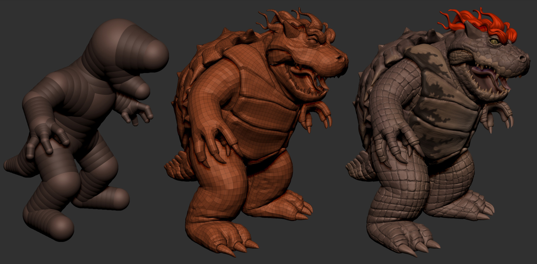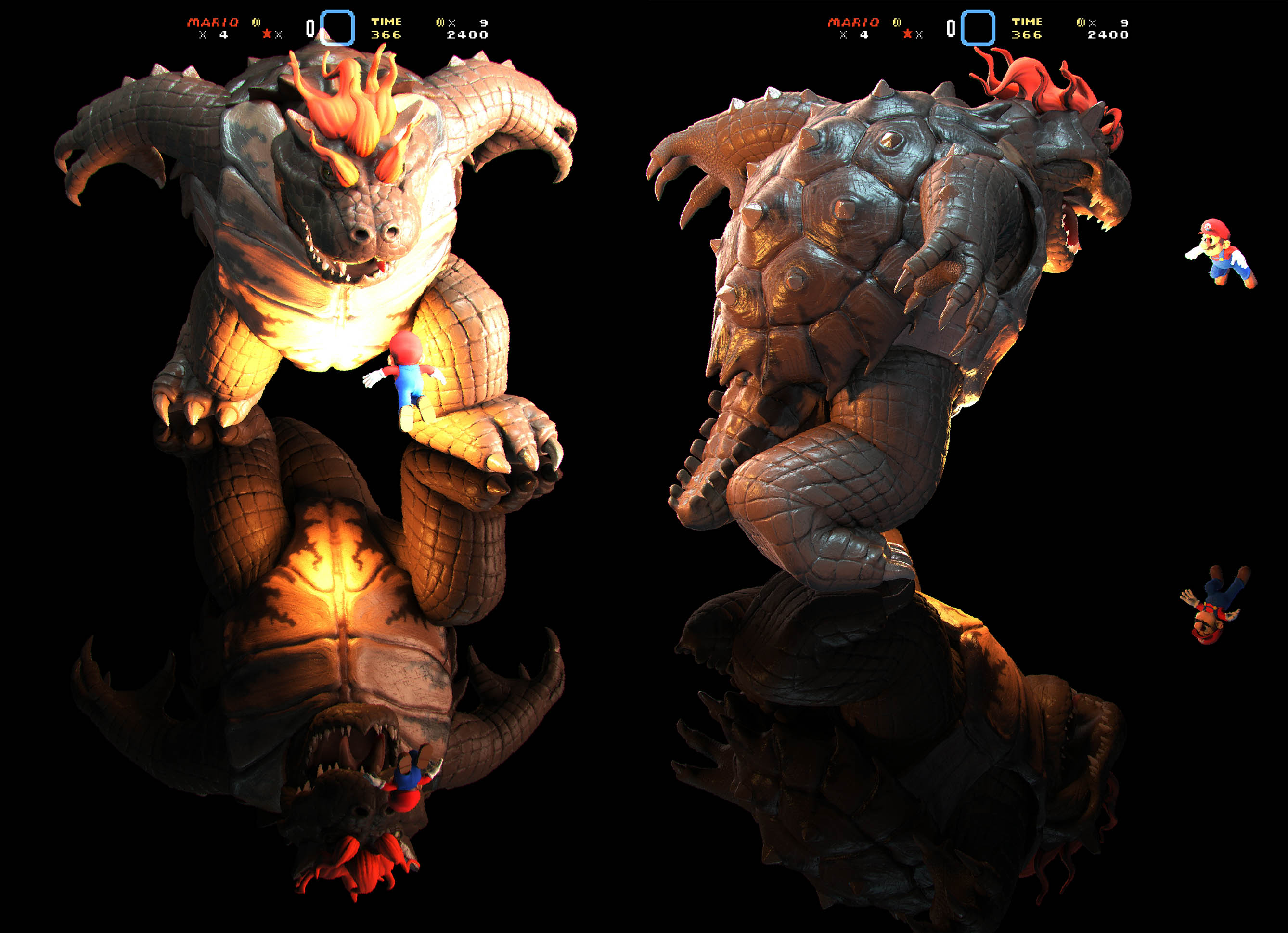 Both models were started from Zspheres, modeled and textured in Zbrush, Mario’s retopo in 3D coat and Bowser’s with Zremesher. UV’s with UV master, and posing with Transpose master.