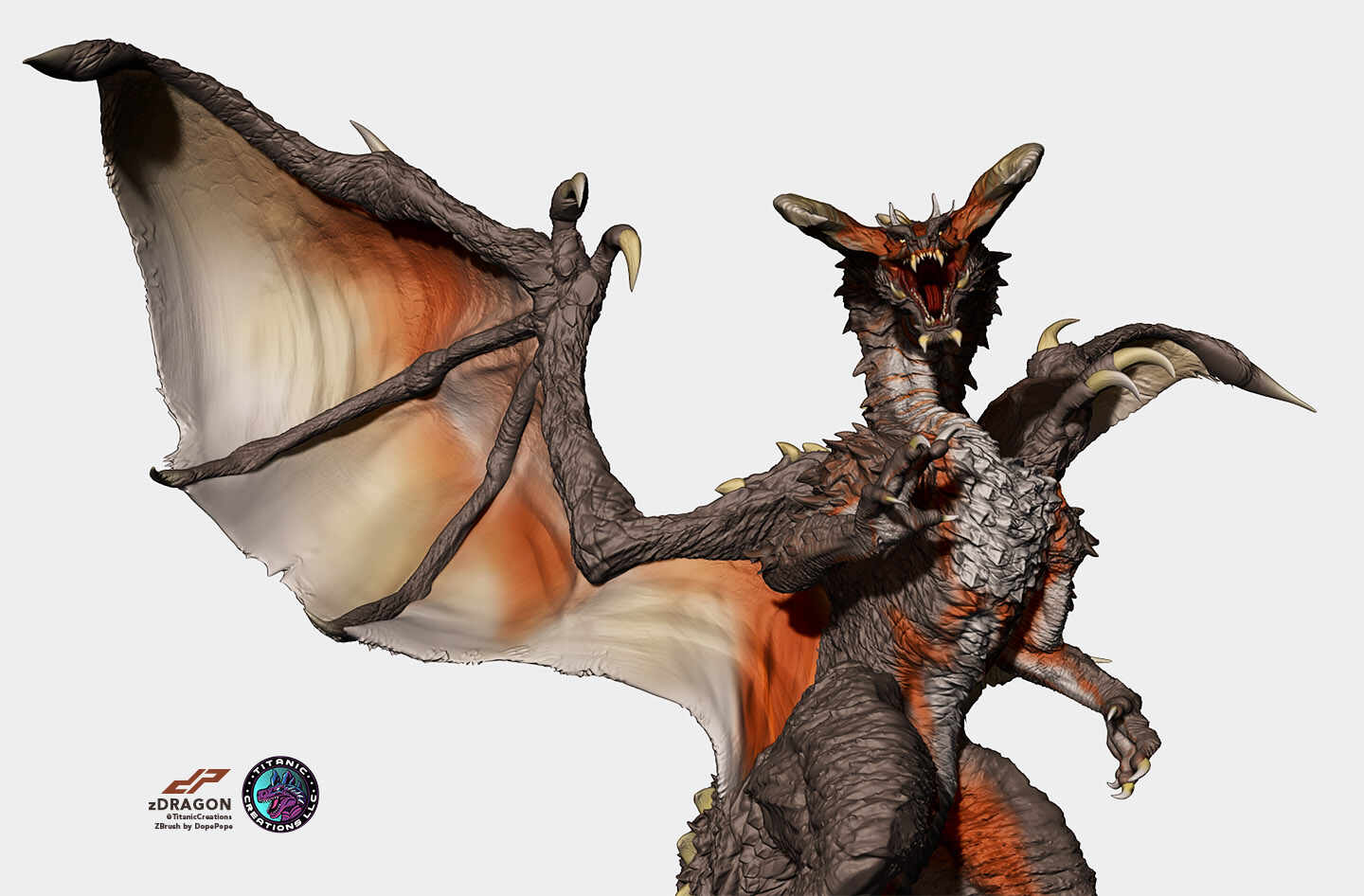 This is the dragon kaiju I was building in ZBrushLive streams for a while. A death in the family made me step away from the streams for a bit, and due to this being for a client I had to finish it up outside of the streams. Sorry to all those that watched and were waiting to see the final steps. Here’s a posed and painted version.