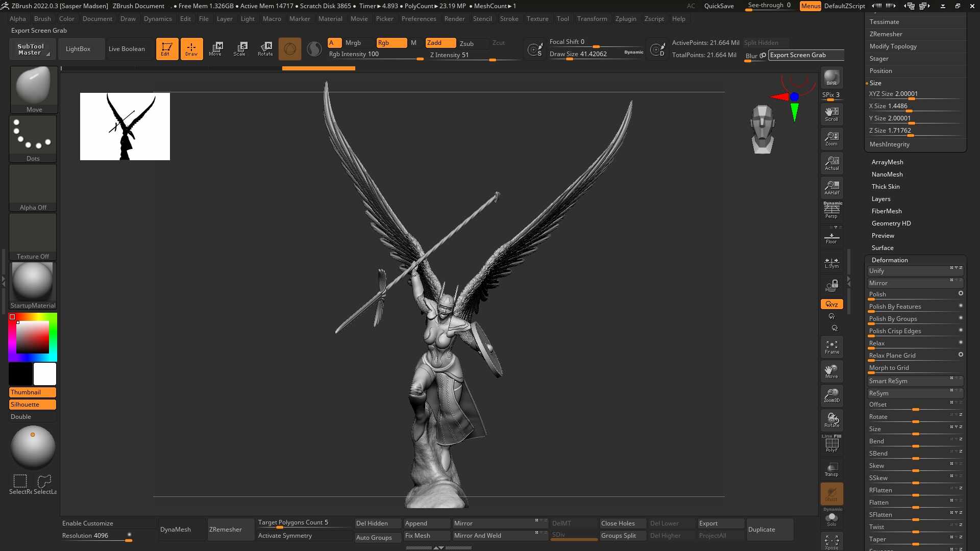 DynaMesh has been designed to create low and middle resolution sculpting stages, making it a perfect way to create your base mesh before diving deeper into all the powerful traditional ZBrush sculpting and editing tools