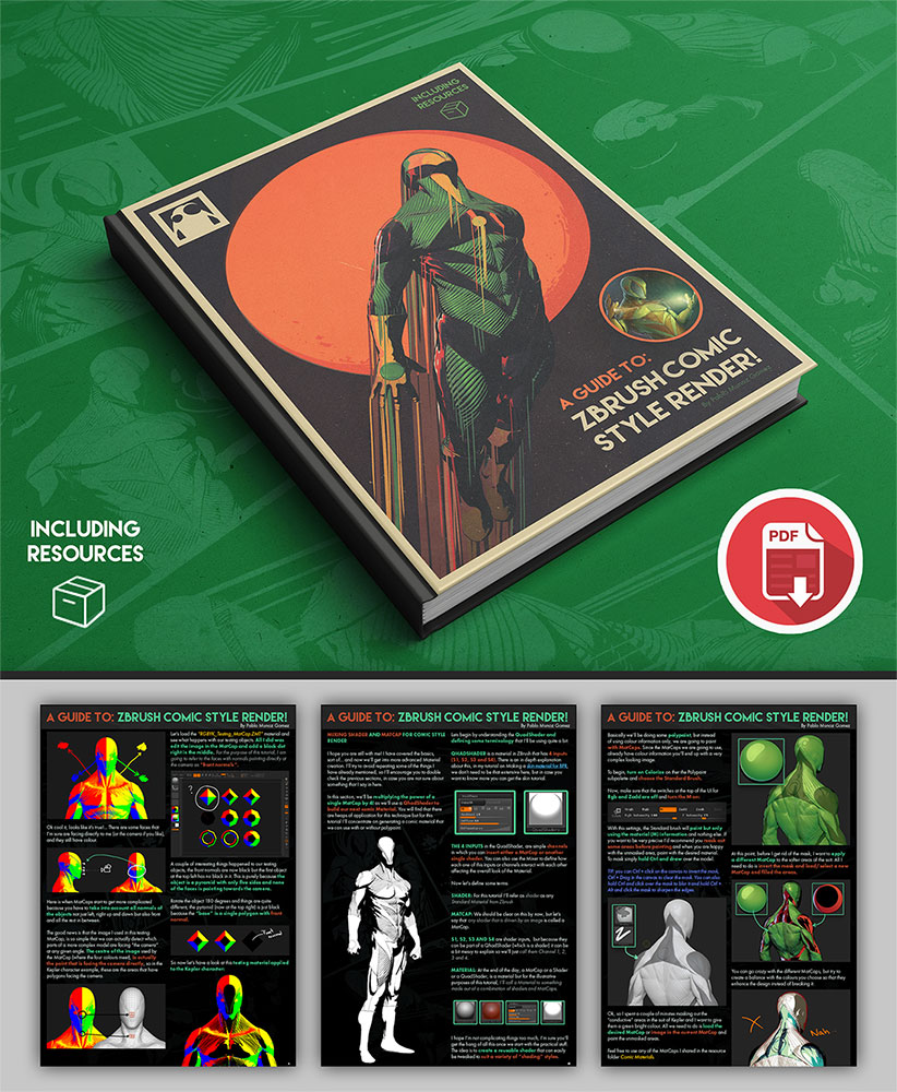 It’s an in-depth 40 pages guide, that I hope will shed a light on my workflow and the techniques I use to achieve the comic-style renders. I also packed a bunch of resources including materials, matcap images, alphas and testing models for you to play with!