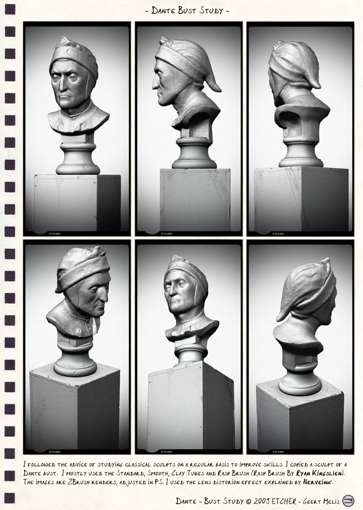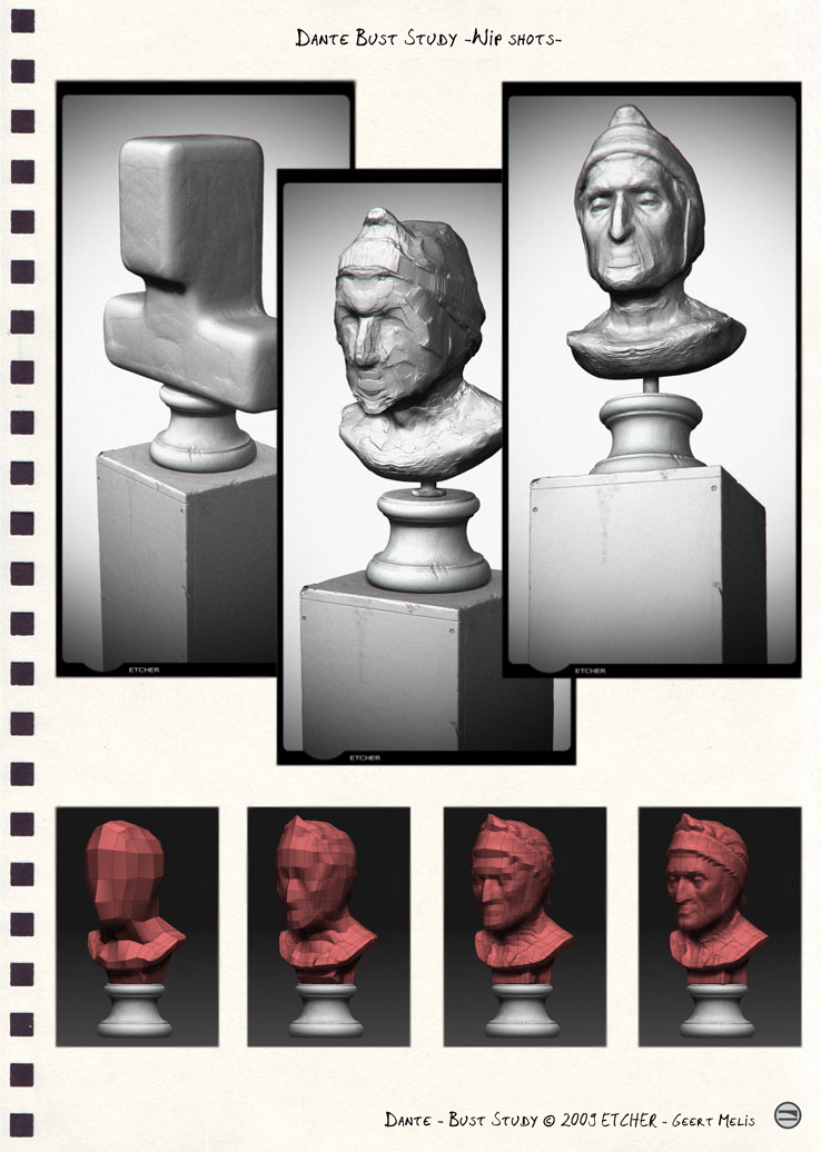 Anyway, I followed the advice of studying traditional sculpts on a regular basis to improve skills. I copied a sculpt of a Dante bust. After finishing the copy, I removed hat and clothes to further study the anatomy. The third set of images show where I am now: studying the muscles of the head and underlying skeleton. I will eventually use this set of sculpts to exercise my polypaint and retopo.