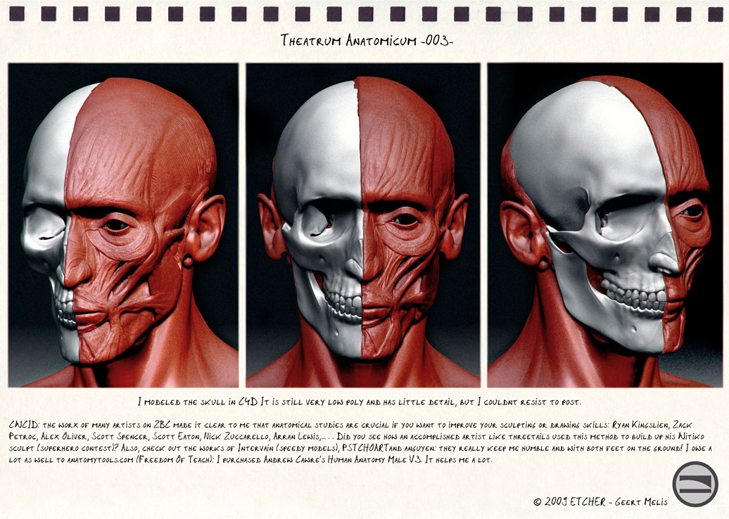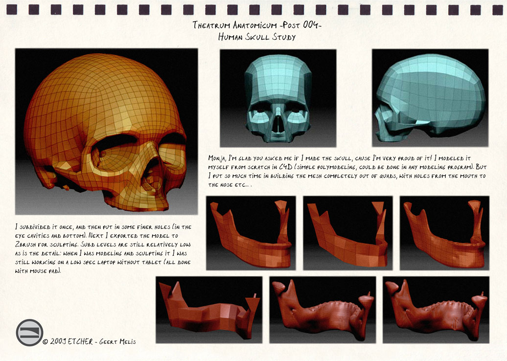 Moni-Poroni: I’m glad you asked, cause I’m very proud of that skull! I modeled it myself from scratch in C4D (simple polymodeling, could be done in any modeling program). But I put so much time in building the mesh completely out of quads, with holes from the mouth to the nose etc. I subdivided it once, and then put in some finer holes (in the eye cavities and bottom). Next I exported the model to Zbrush for sculpting. Subd levels are still relatively low as is the detail: when I was modeling and sculpting it I was still working on a low spec laptop without tablet (all done with mouse pad). My reference came from several medical and artistic anatomy books, as well as a plastic cast from a real skull. If you have more questions, just ask!