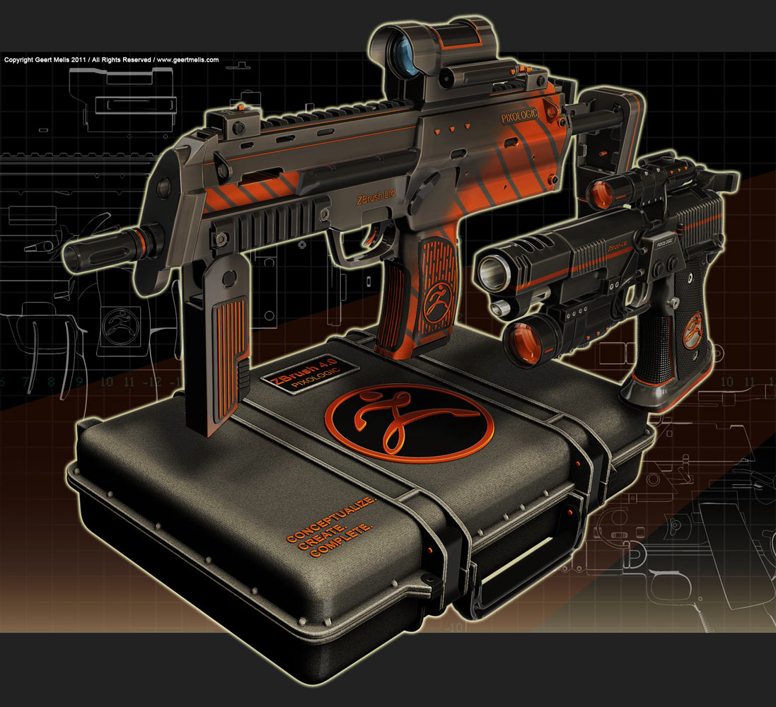 I wanted to share these images I did for Digital Production magazine. These weapons where modeled and rendered entirely within ZBrush (render passes comped in Photoshop). Although these weapons will be used for “Thin Veil of Reality” characters, I could not resist customizing them for this occasion- it’s probably my first “ZBrush Fan-Art”.