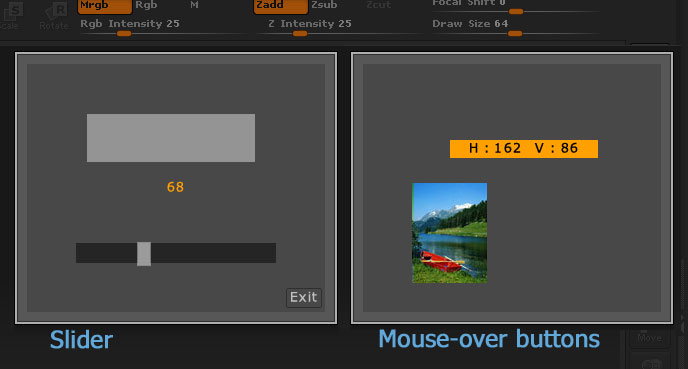 The MouseOver button interface has the duration set to 0.001 from the start. This means that mousing over the picture will change it. Clicking on the picture will exit the interface. If you mouse over the orange bar it will be picked up by the mouse and dragged around. Clicking it will return it to its starting position. The button actions here are got by using the mouse state, which registers while a note is displayed, so the buttons used are all disabled as the duration is never at 0 and they don’t work.