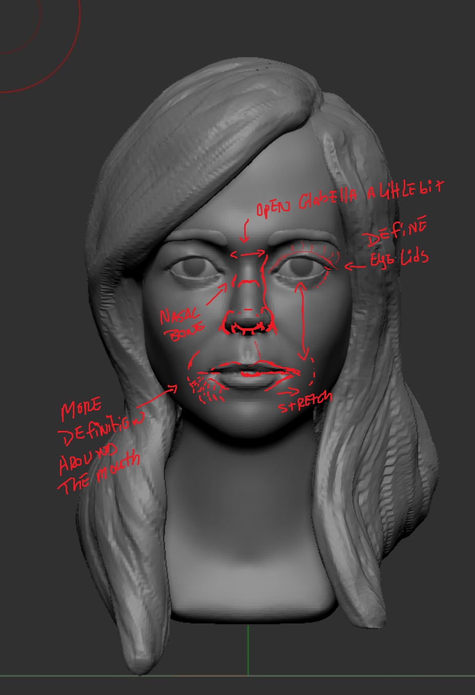 Looking good. As for feedback, what I would say is to define the shape of the eyes, nose and mouth a bit more. For the eyes, there seem to be no indication of eyelids, also I would spend a little bit more time on the under eyelid and give it a little more volume. For the Nose there seems to be missing an indication of the nasal bone landmark (area that goes from bone to cartilage). Also give a little bit of definition on the wings of the nose and how they attach on the face. Lastly for the mouth I would just stretch the edge of the lips, because the edge of the mouth usually aligns to the center of the pupil. Also, I would just define the muscles of mouth a bit more. I’ve attached an image to make it more clear. Hope this helps.