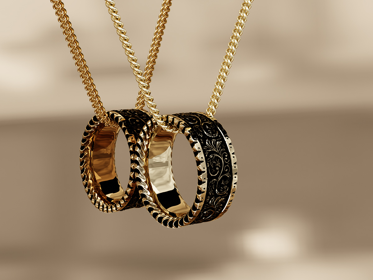 3D design and rendering of a beautiful gold ring with a detailed floral pattern, deep chasing and an asymmetrical multidirectional border pattern that shimmers in the rays of light.