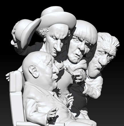 Curly, Larry, Moe and Shemp, did appear all together briefly only one time on screen, in a Three Stooges Columbia Pictures short, ‘Hold that Lion’, which this vignette is modeled after. Curly, recovering from a stroke in real life, had a cameo as a sleeping (snoring) passenger on a train, hence the clothespin.