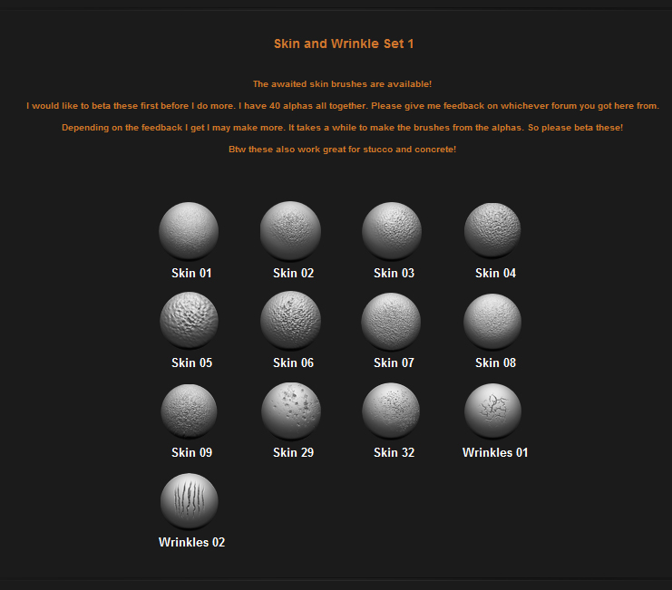 Here is the first set of skin and wrinkle brushes. Please give me as much feedback as possible! I have many more to make, but I would like a little beta before I make them. Don’t expect these to be setup exactly how you want them. Feel free to customize them for yourself. I didn’t even try to adjust many settings for them since there are so many ways to sculpt skin and pores etc.