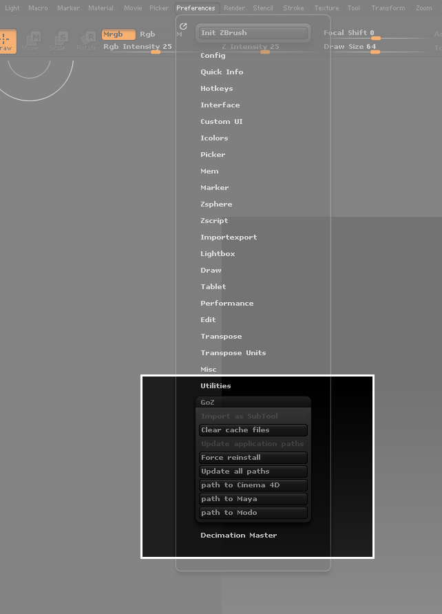 The only instructions I found for Photoshop was about copying a plugin into photoshop which I did. There is no reference to Photoshop inside Zbrush. When I press the Goz button it just sends the model to Sculptrix (the only other sofware on the list that I have). There are no options for sending it to Photoshop. I must be missing something in the installation. I can save the model as an obj and then open that in Photoshop, but I thought I was supposed to be able to use Goz to get it there. When I then tried to send the model to Zbrush using the Photoshop plugin under the automated menu it just gave me an error message.