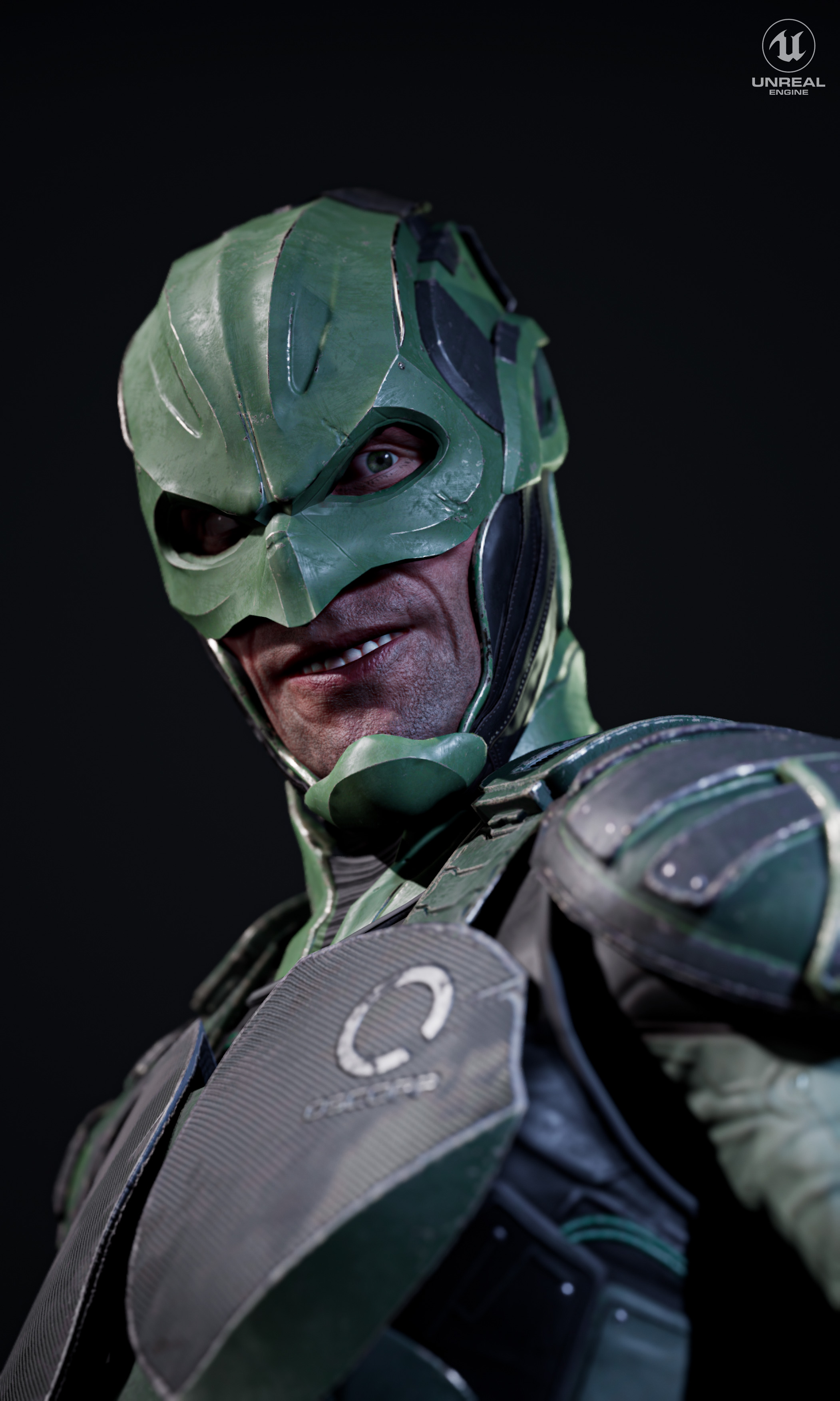 The mesh was built in zBrush, Maya and Cinema 4D, textured using Photoshop and Substance Painter. Base Unreal Realistic Human shaders were used for the skin, eyes and the hair with extra modifications. The rest of the body used a custom written shader.