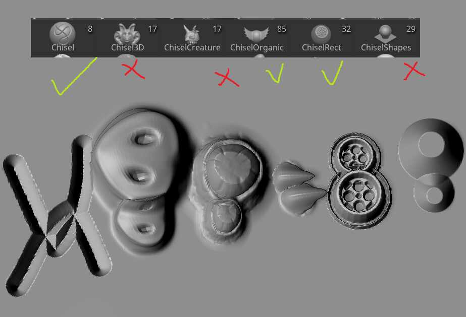 B) Use the Brush> Create > Copy Meshes and Paste Replace functions to copy the VDM meshes from one brush into the Chisel Brush. This will replace the meshes for that brush but keep the settings of the original. Change the stroke type to “Drag Rect” then save the brush out with Brush> Save as into the Lightbox folders and load it on demand.