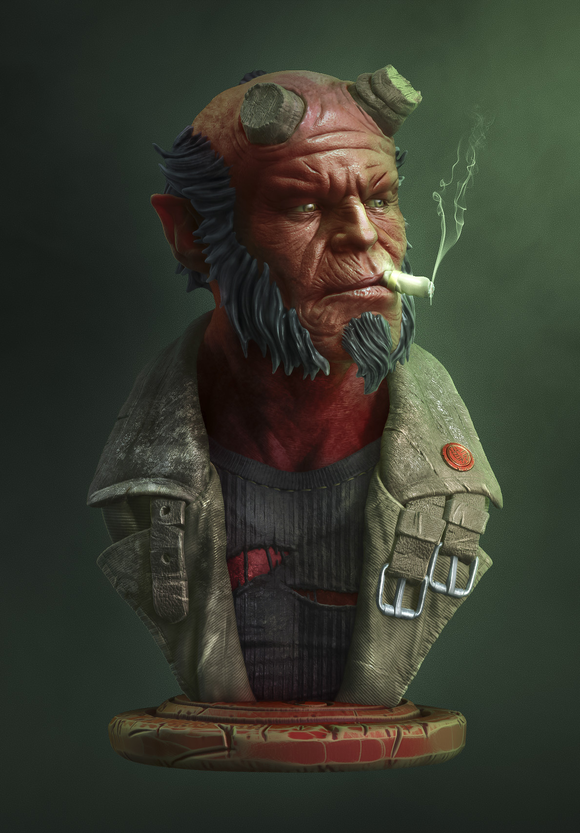 I wanted to do a Hellboy for a long time, so I did this bust, since I’m also digging into 3D printing. It was rendered in a way that I’m not used to: in Zbrush and then comping the passes in Photoshop.