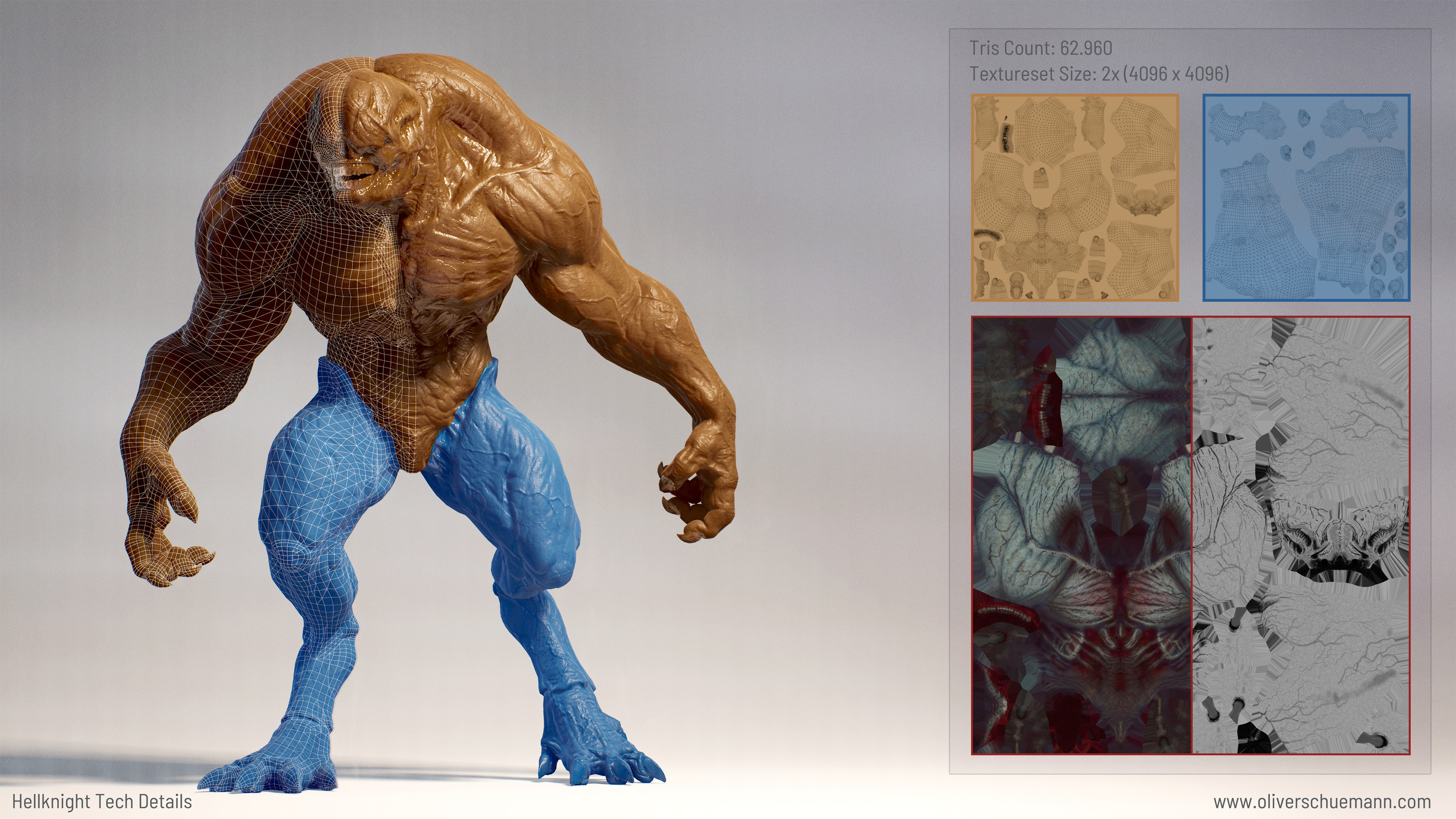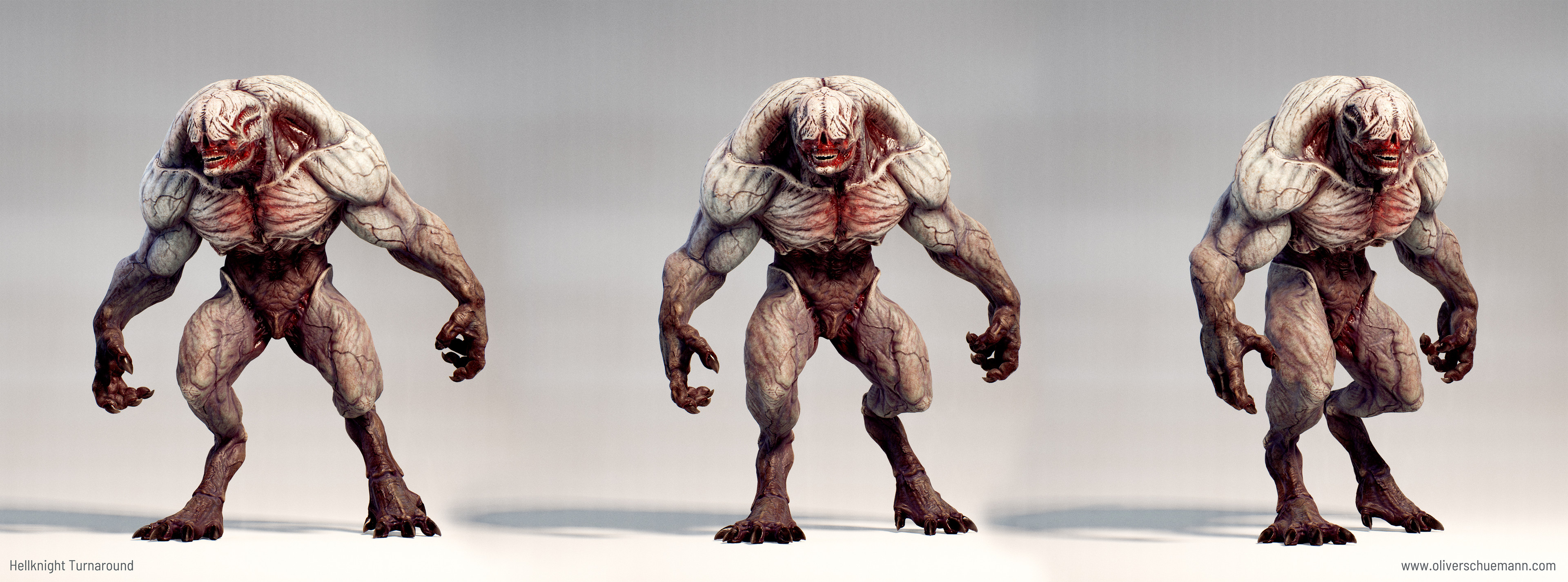 I was so fascinated by this raw and brutal design, that I couldn’t resist making my own version of the Hellknight. One of my biggest intentions was to create a hybrid of modern Doom graphics and Doom 3 esthetics.