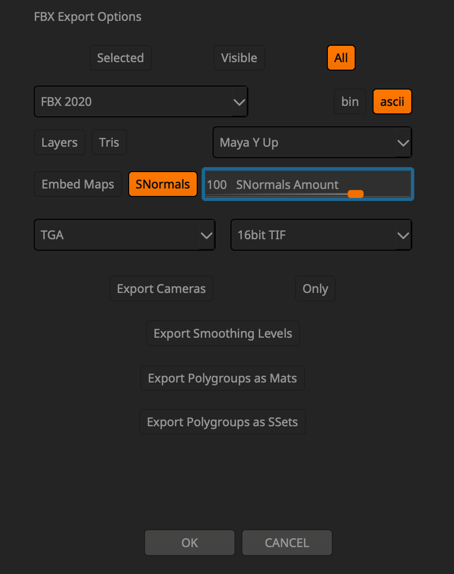 I’m outputting from zbrush as an FBX, having decimated the models. The characters started at around 2-3 million polys. They are then decimated at 250k, and their clothing elements at 20k. Fbx file size ends up around 250mb.