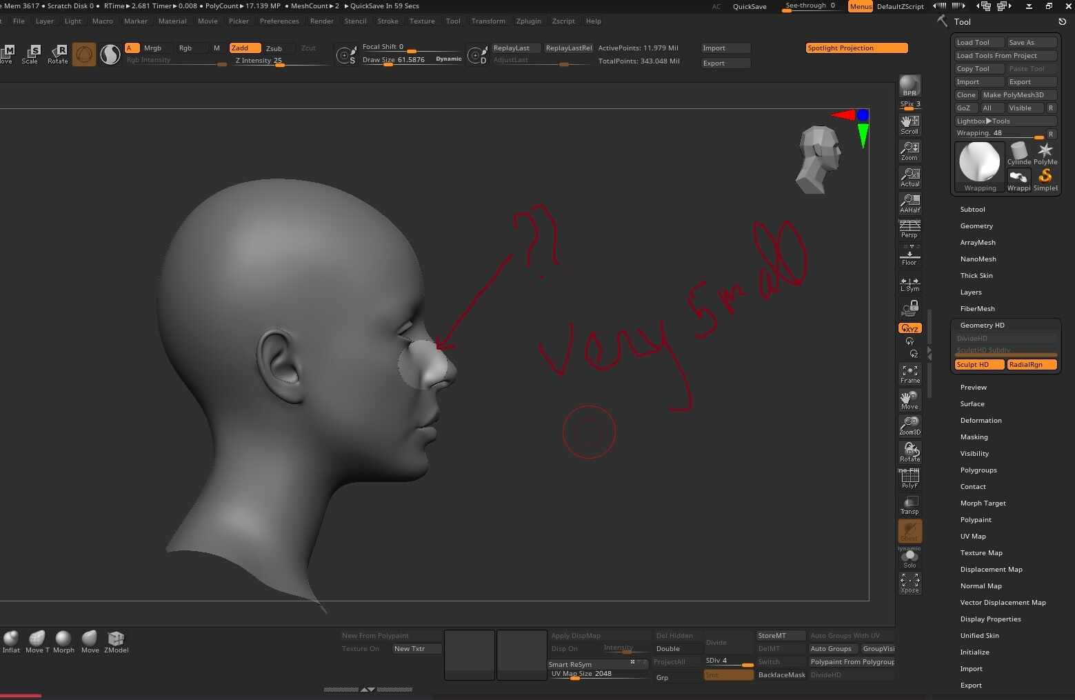 The size of the preview area that Sculpt HD is able to preview is based on how heavily subdivided that area is. The more polygons there are, the smaller this area will be. There is no way around this other than to subdivide the mesh less with HD Geo, start HD Geo from a lower level of regular subdivision, or to more carefully manage and optimize your topology to require less subdivision overall for high detail areas.
