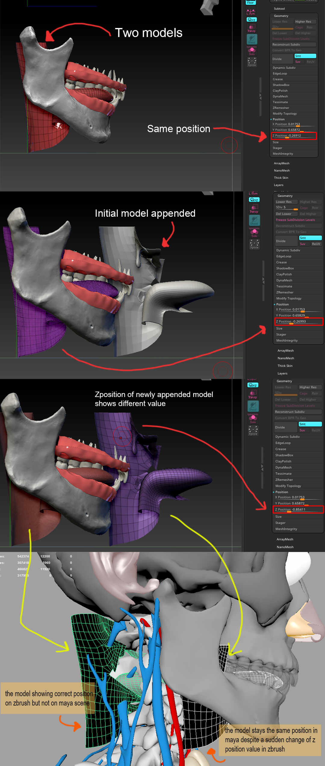 4th screencapture what made me even frustrated is that the low poly model of mouth interior that i sculpted on zbrush is being on the wrong position once i imported it to maya despite the correct zposition in zbrush, WHILE the initial model which zposition value changed suddenly being on the correct position in maya scene.