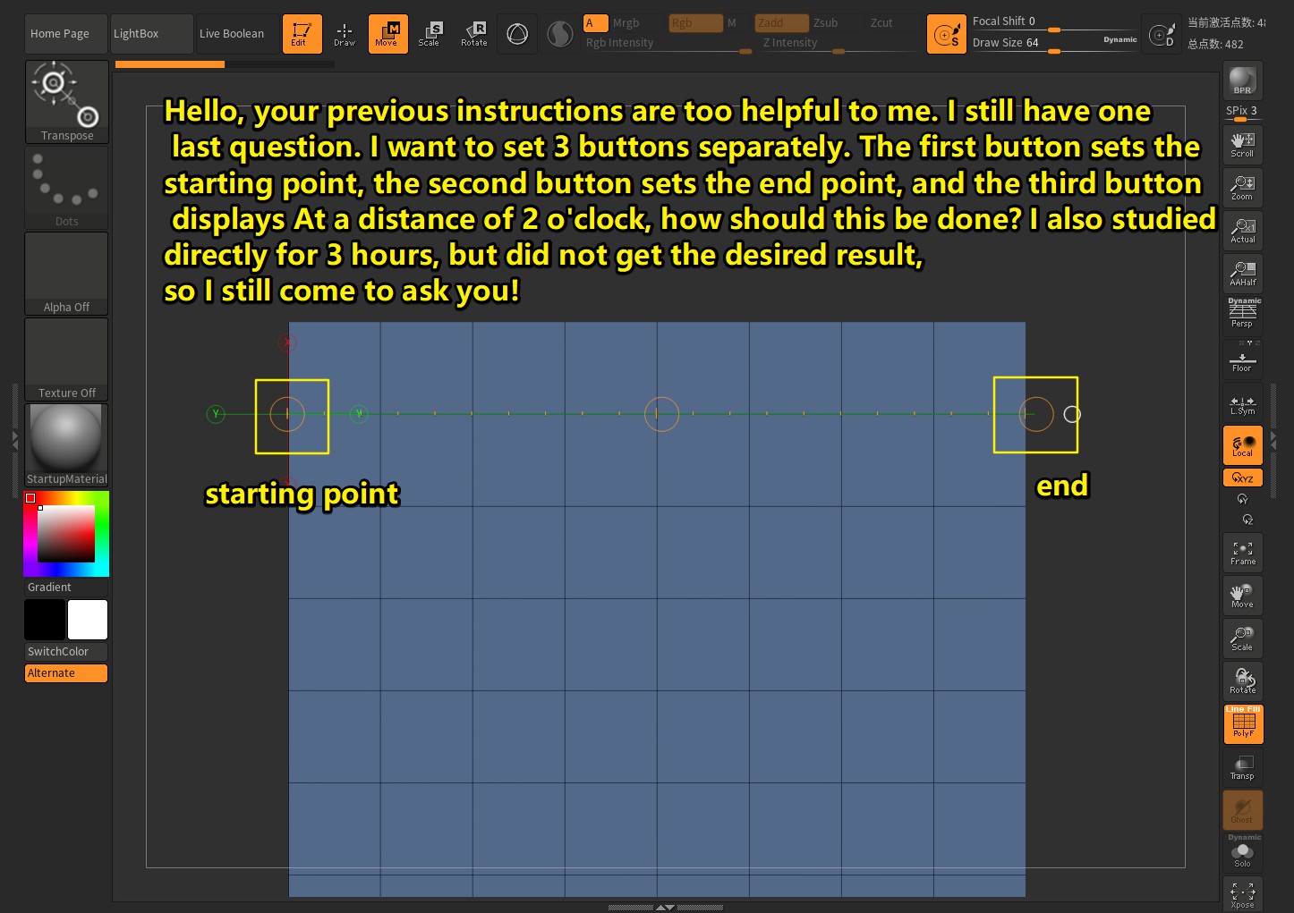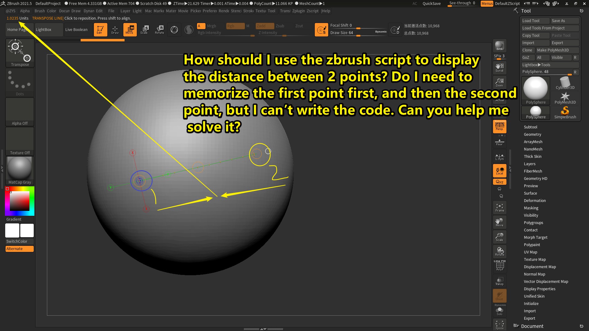 How should I use the zbrush script to display the distance between 2 points? Do I need to memorize the first point first, and then the second point, but I can’t write the code. Can you help me solve it?
