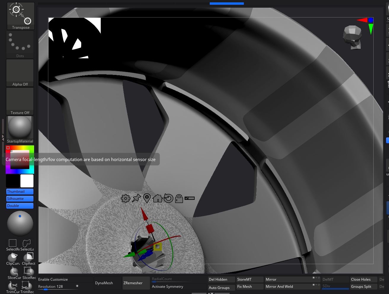 You could then carefully mask all but the area you want to affect on the original subtool so you don’t accidentally affect the “spokes”, then use the ZProject brush over the raised sections. It will pick up the surface from the underlying subtool and flatten that section down to the surface of the duplicate subtool. You could also theoretically use the Project All function in the subtool palette to do the same thing. Protecting areas you don’t want to be affected with masking is crucial though.