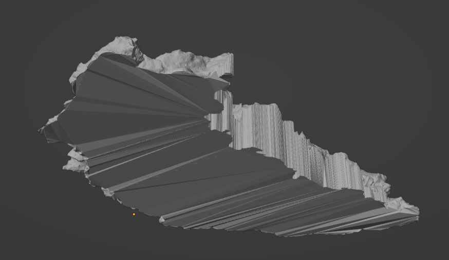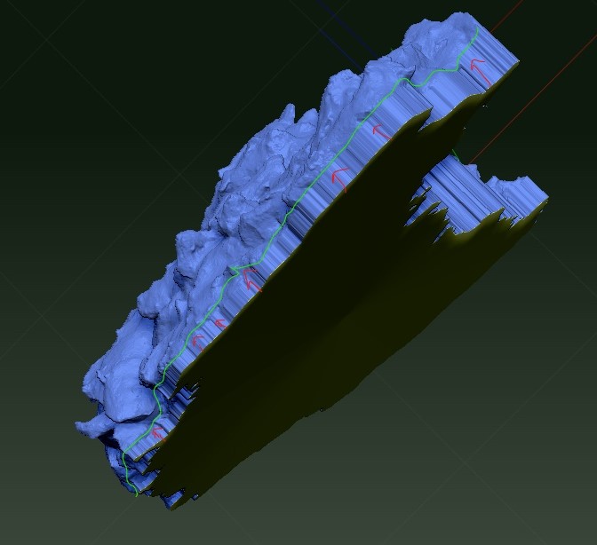 Gizmo : Goto Unmasked Mesh Center and Drag the unmasked vertices down as far as you like (say 1-2 times the height of the scan) to make a “wall” of polygons around all open edges. (At this stage you can clearly see there are several open holes in the body of the scan which is giving close holes functionality a hard time). However the problem can be mitigated with Live Boolean as follows.
