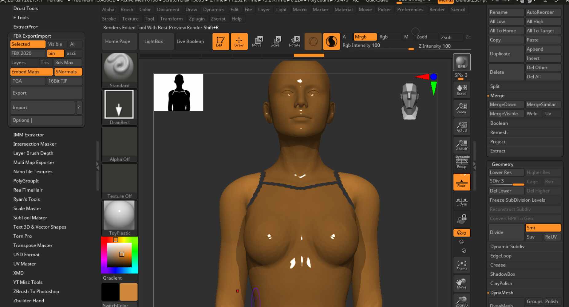 I trying to import an fbx file with a view to adding texture maps to it. It’s a female form which is split into subtools such as head, arms, legs and torso. If I subdivide the individual subtools, the geo is nice and smooth but they split apart, leaving a gap inbetween each one. I can then add the texture maps to each individual subtool however I can’t then knit the whole model back together.